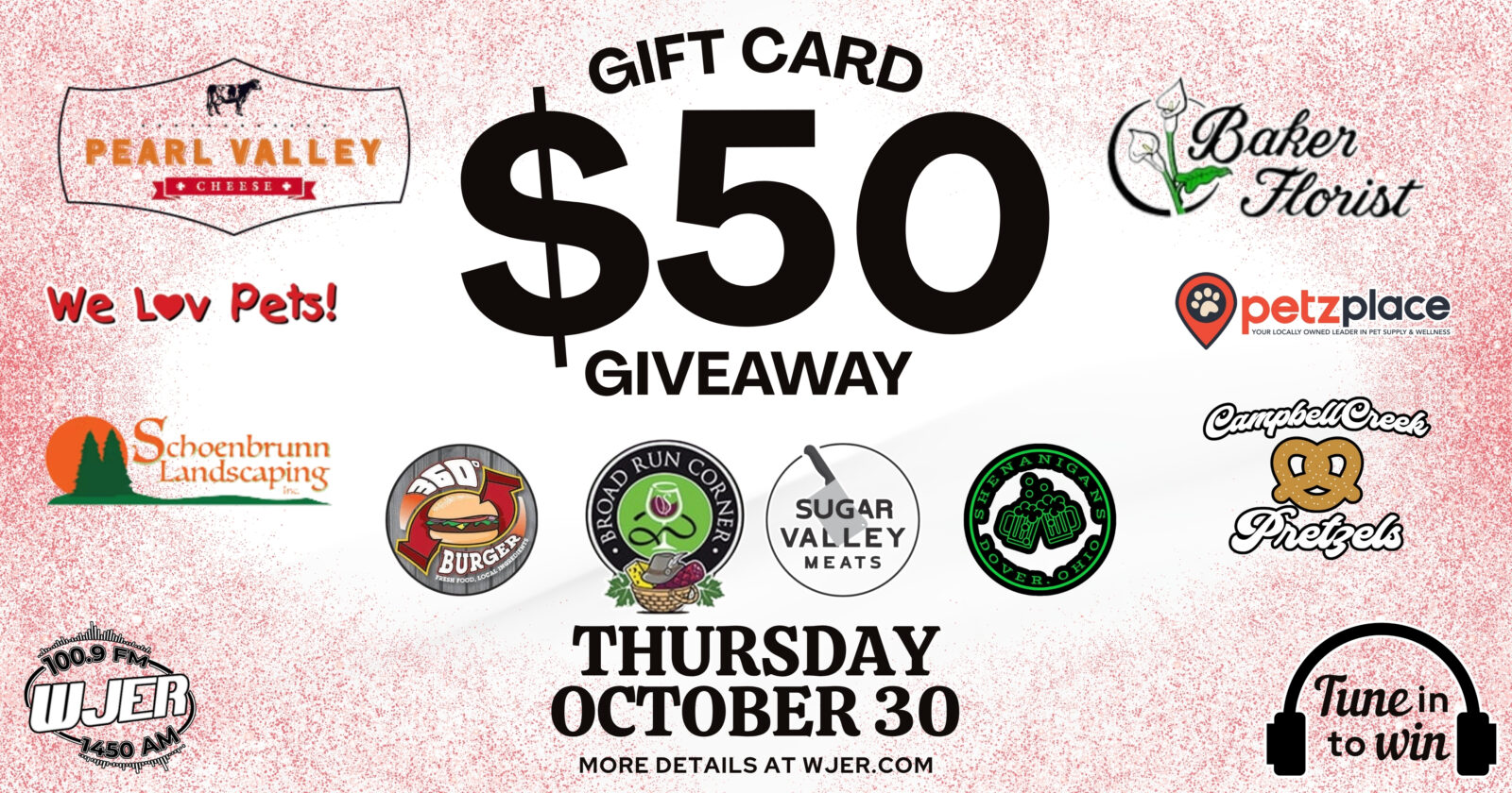 The next $50 gift card giveaway is coming soon. Tune in all day on Thursday, October 30! You could win a $50 gift card to one of these great LOCAL businesses: