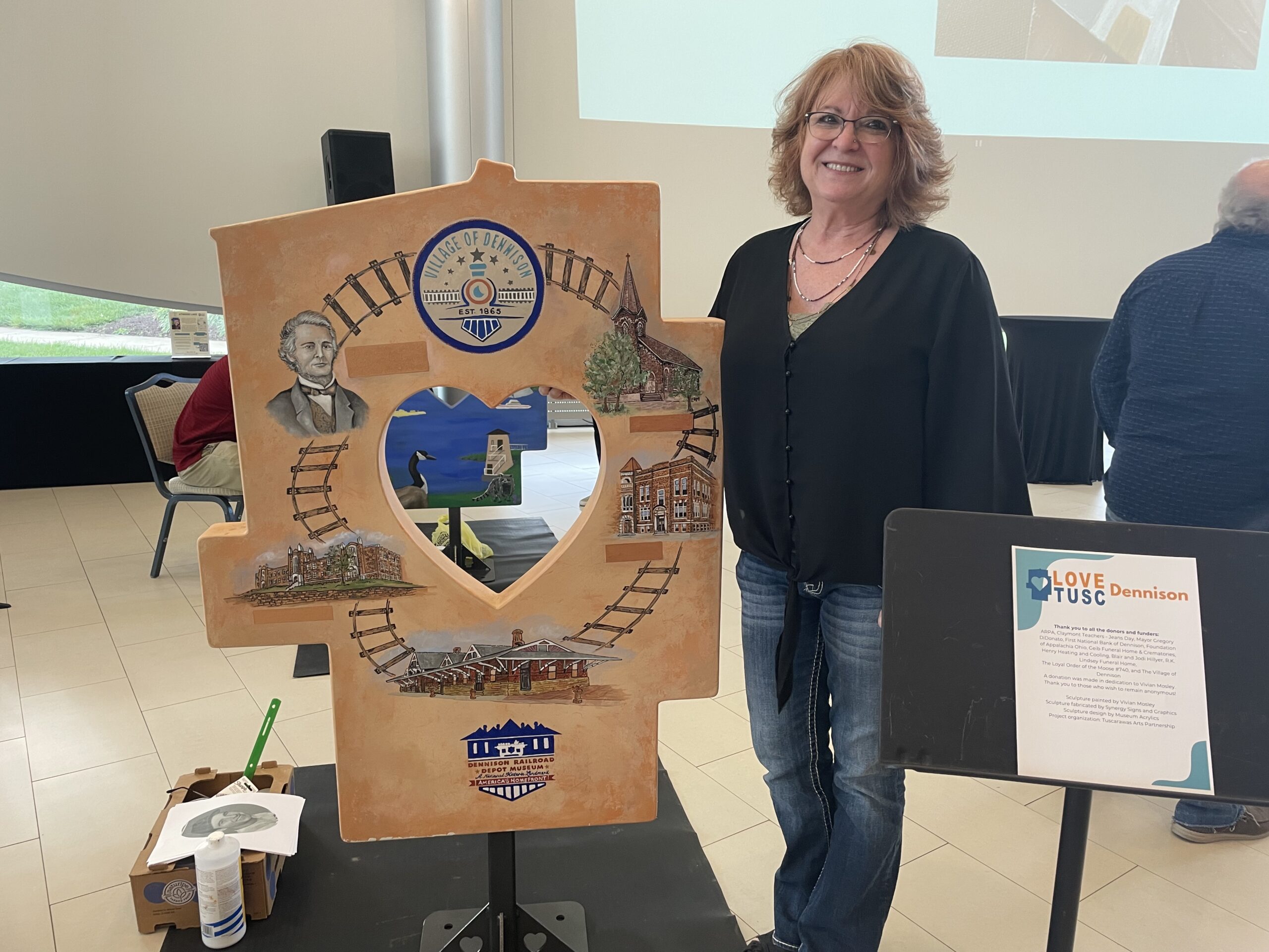 - Vivian Mosley with the Love Tusc sculpture she painted for the Village of Dennison.