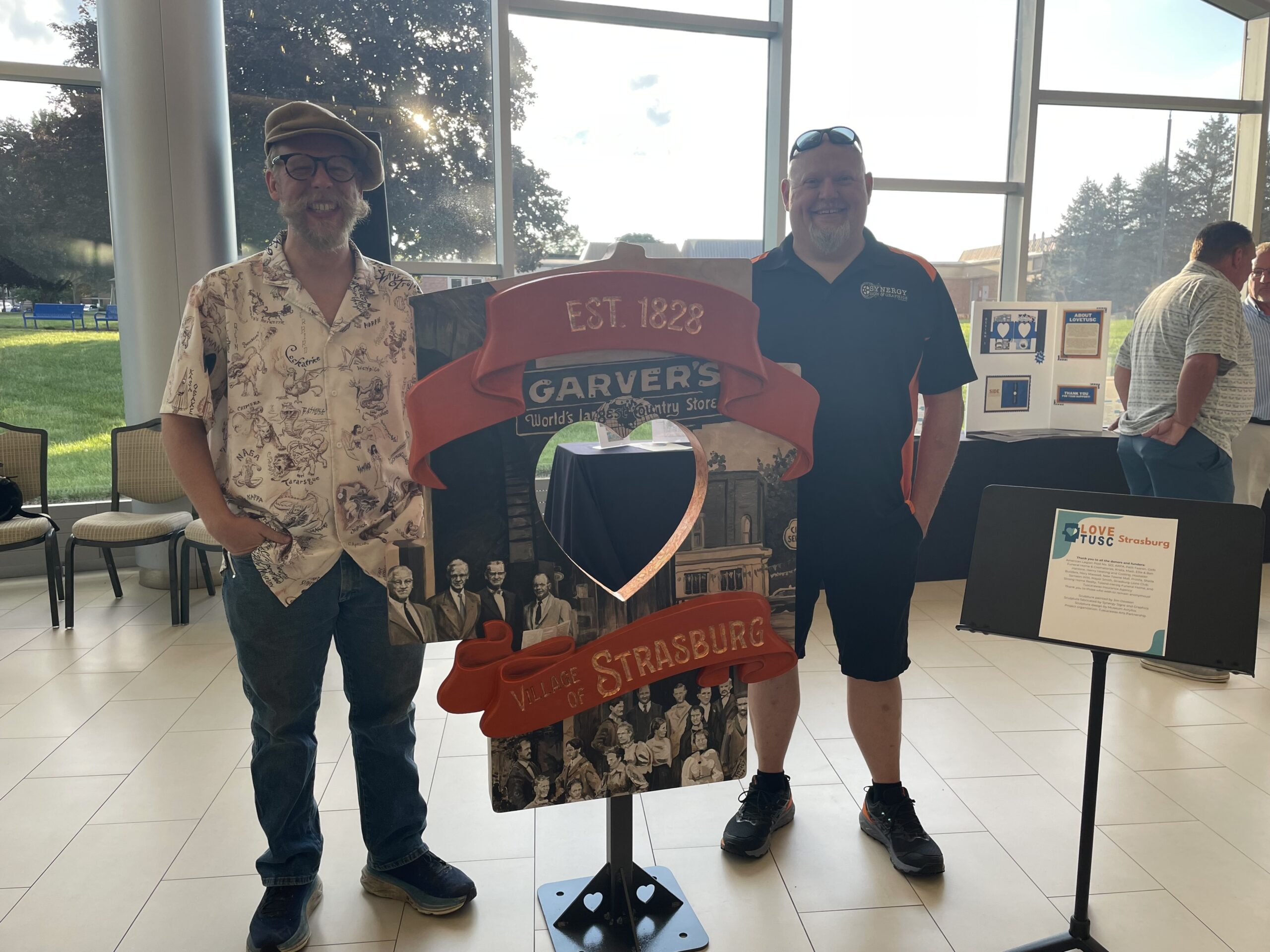 - Synergy Signs owner Jim Dawson and employee Dave McDowell with the sculpture the team created for the Village of Strasburg.
