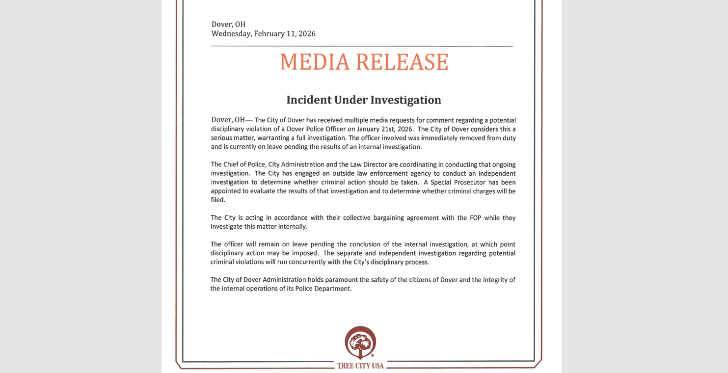 Dover Safety Director Robert Everett in a media release said the city learned of the incident on Jan. 21 but did not offer any specifics about what happened or when and where it happened. The release says the city will not be commenting further until an investigation and/or potential disciplinary actions are complete.