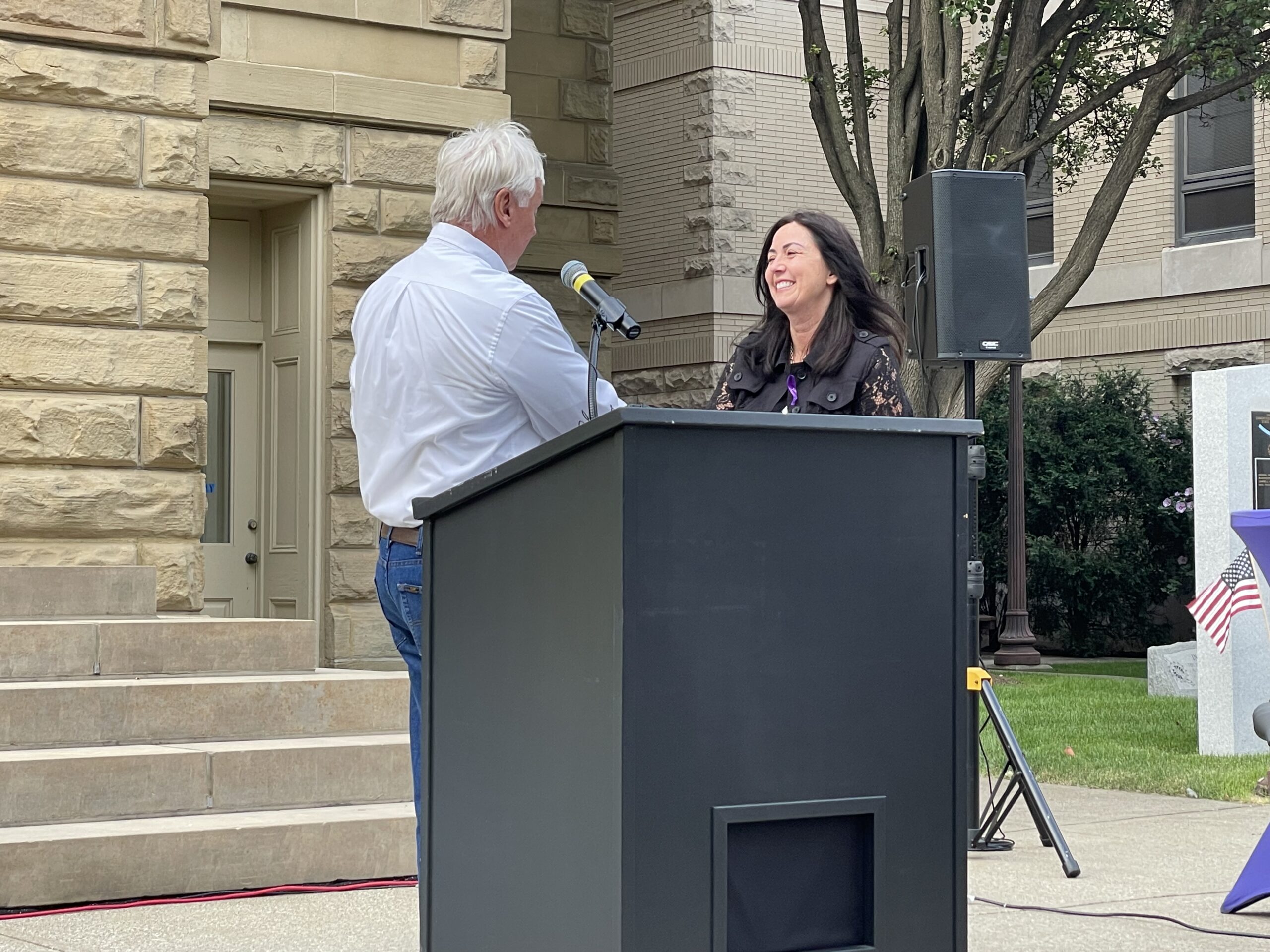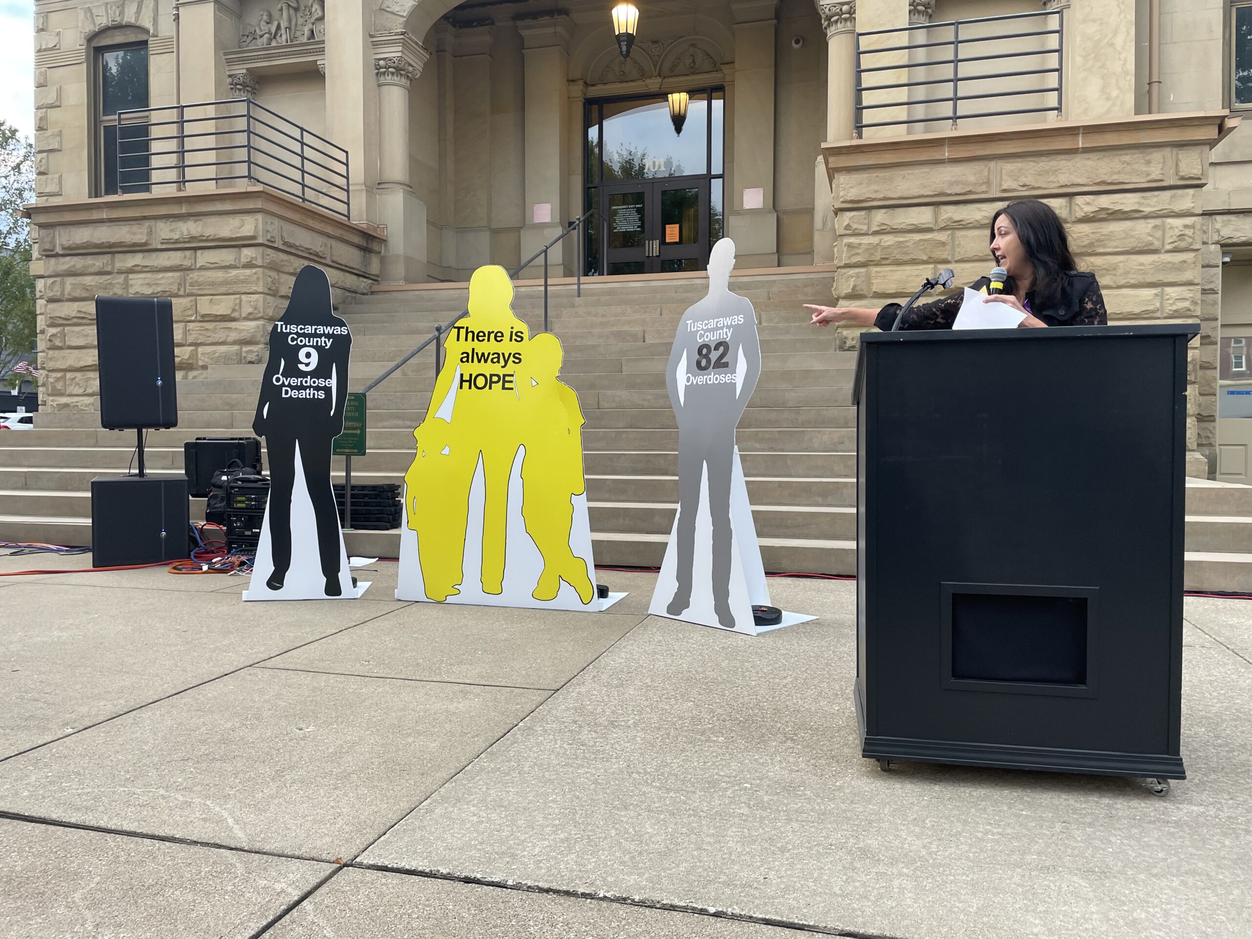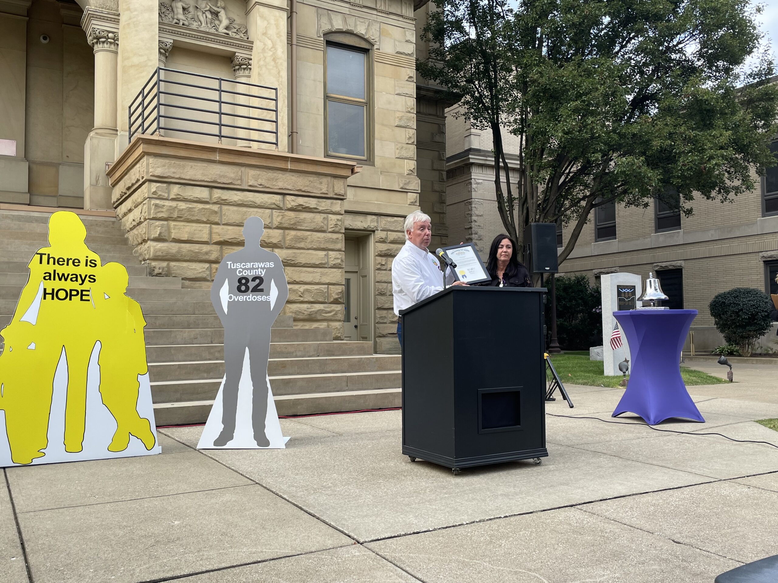 Representatives from the Tuscarawas County Addiction Task Force and member agencies led an Overdose Awareness Day tribute on the plaza in front of the courthouse. ADAMHS Board Executive Director Natalie Bollon was pleased with how many people came out for the event, which she says never would have taken place a decade ago because of the stigma surrounding addiction.