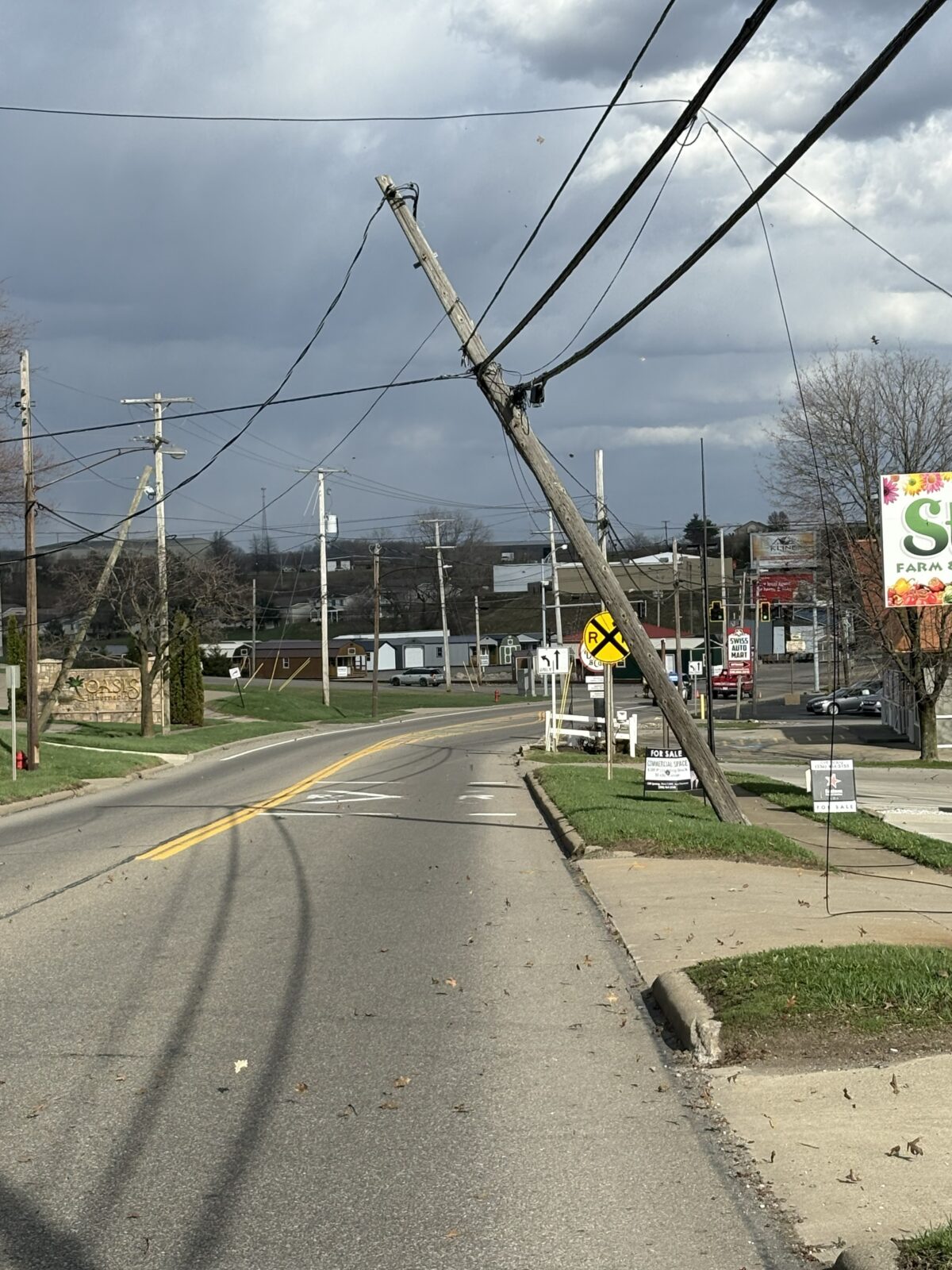 Sugarcreek firefighters urged drivers to avoid State Route 39 between Factory Street and Edelweiss Drive on Friday after a snapped utility pole brought down power lines and traffic lights. Photos courtesy of Sugarcreek Fire Chief John Meek.