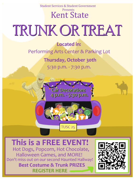 Kent State University at Tuscarawas Student Services and Student Government will host a community Trunk or Treat event on Thurs., Oct. 30, from 5:30 to 7:30 p.m. in the Performing Arts Center and parking lot.