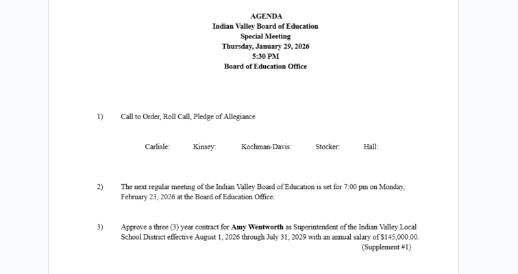 GNADENHUTTEN – The Indian Valley Board of Education is meeting Thursday at 5:30 p.m. with a single item to vote on – approving a three-year contract with Amy Wentworth as superintendent with an annual salary of $145,000.