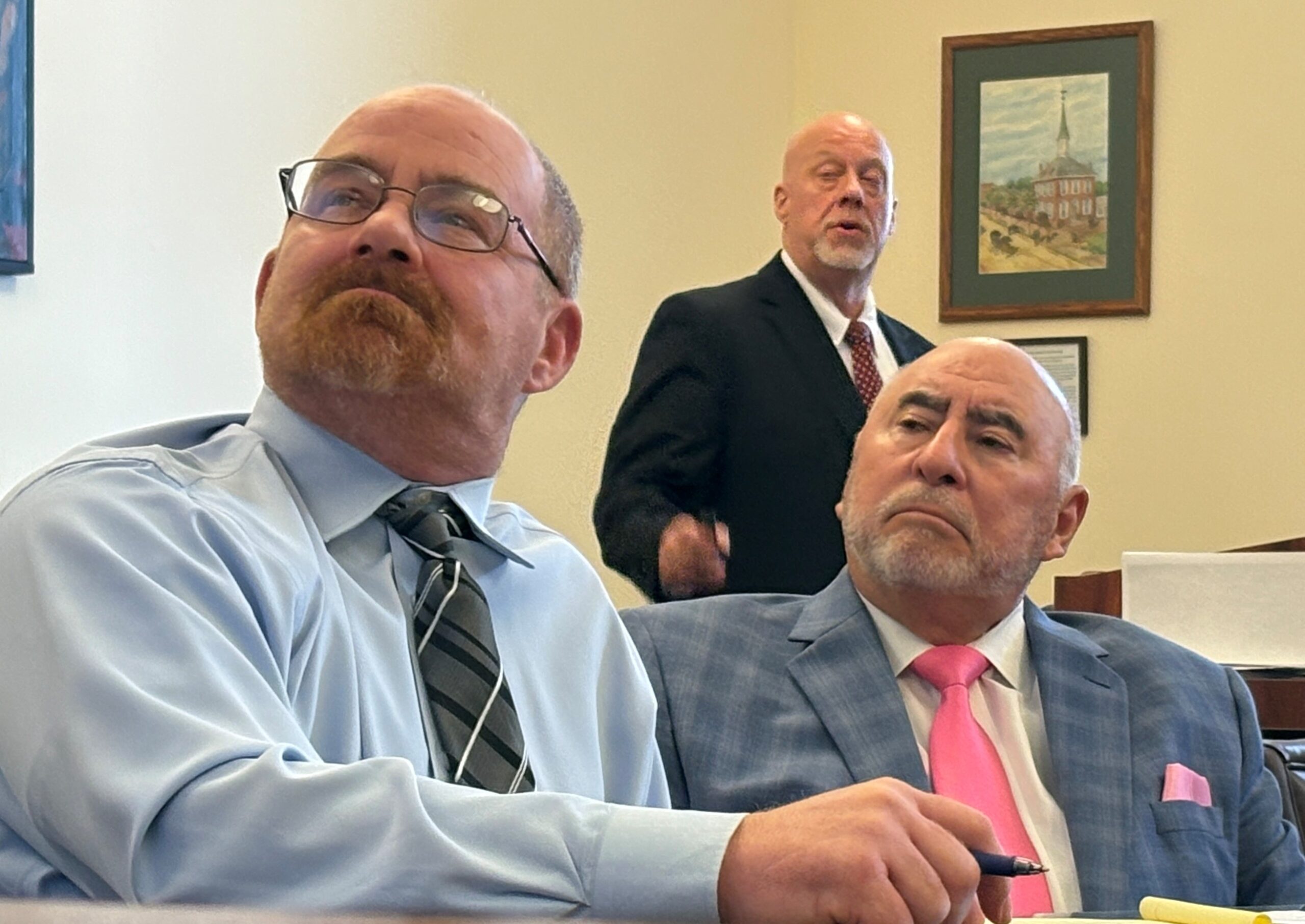 Carl Reynolds, left, and his attorney Christopher DeLaCruz look at a slide projection as Assistant Prosecutor Scott Deedrick presents his closing arguments.