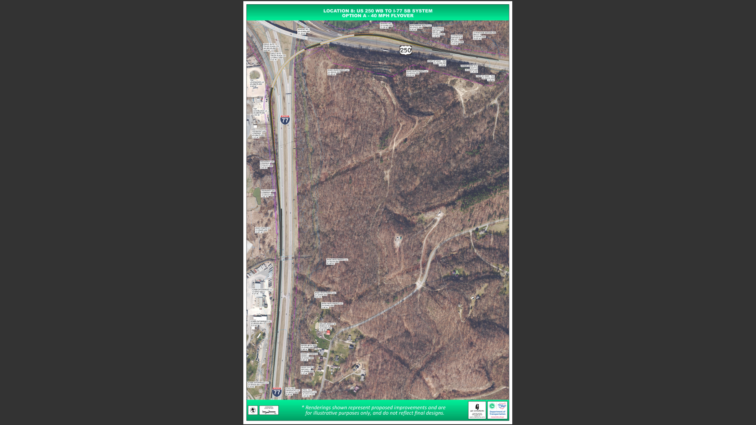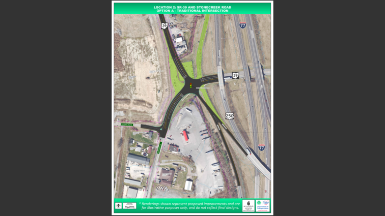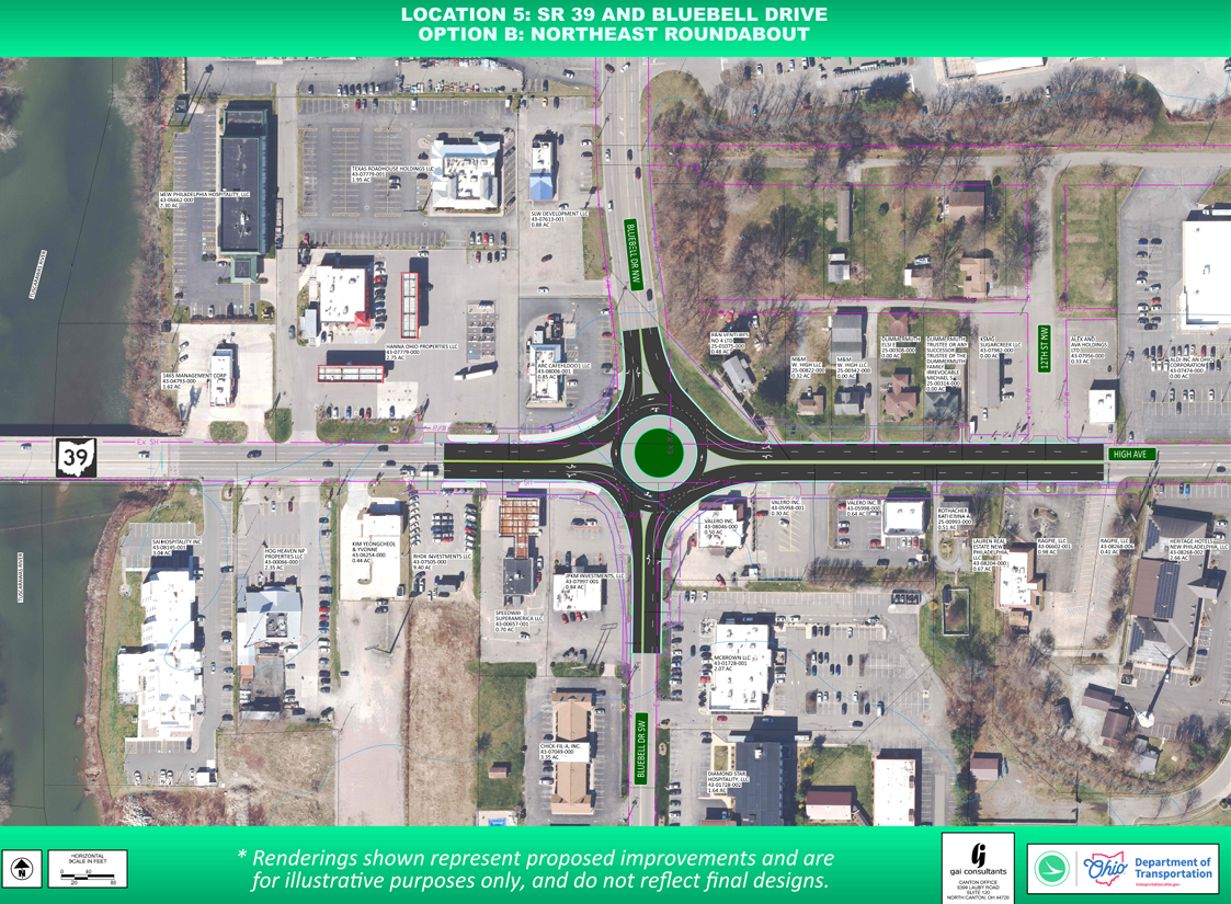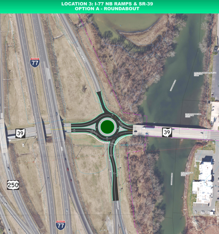 The plan, still in the conceptual stage, has nine locations for improvements. It calls for direct ramps between 77 and 250 with a pair of roundabouts on state Route 39 at Blue Bell Drive and at the I-77 ramps on the other side of the 39 bridge over the Tuscarawas River.