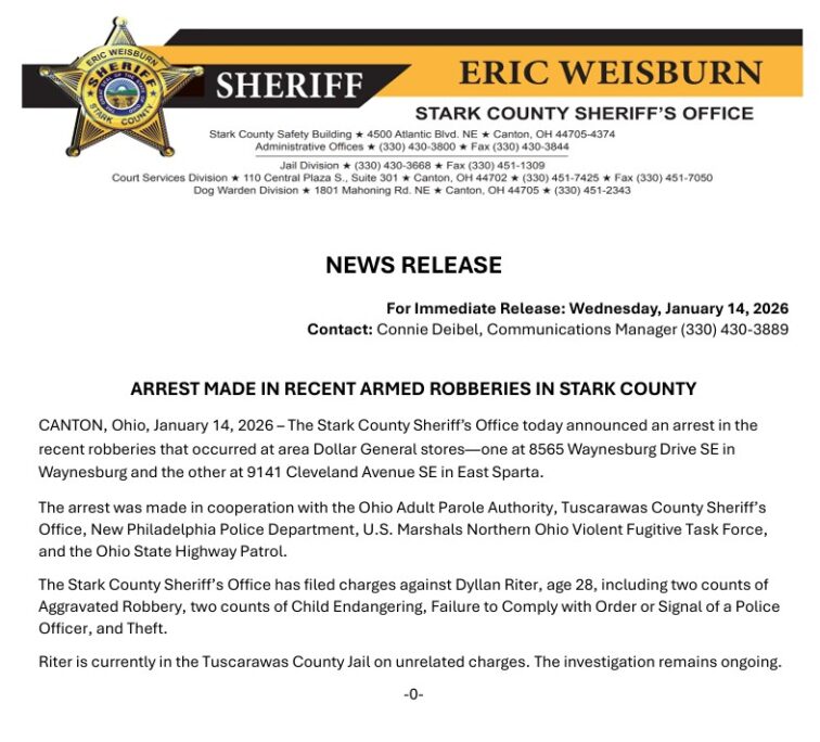 While Dusenberry wouldn’t initially name the suspect, Stark County Sheriff’s officials have since identified him as 28‑year‑old Dyllan Riter, who was wanted in connection with recent robberies at two Dollar General stores. Riter is also listed on the Tuscarawas County Jail roster. Dusenberry said he does have ties to the area.