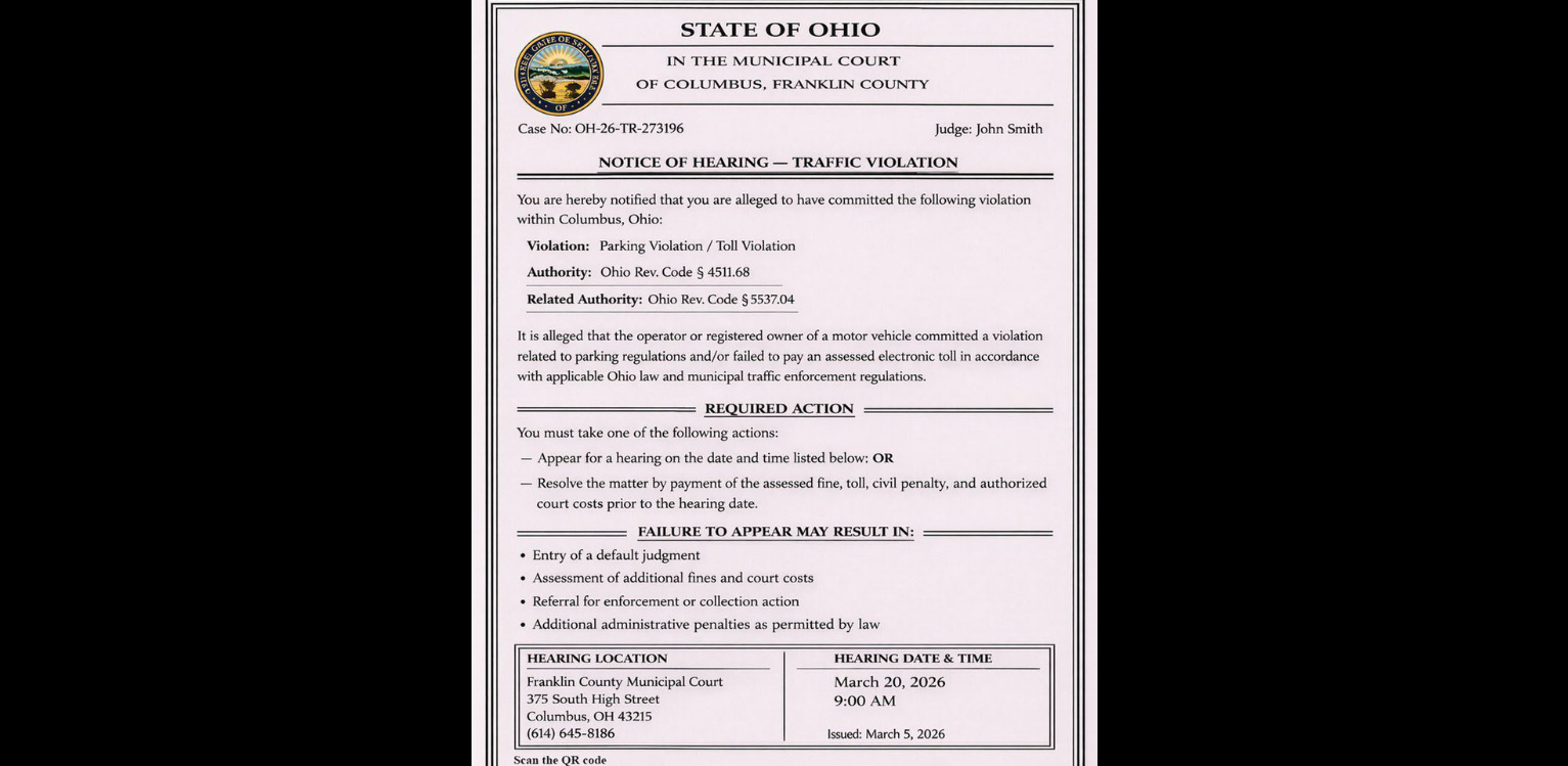 In this one, the scammer texts an official-looking fake summons notifying the recipient of a parking violation in Columbus and asks the victim to scan a QR code to settle an unpaid balance. Some of the signs this is a scam: the summons doesn’t have the recipient’s name anywhere on the form; the Judge’s name – John Smith – is a pretty good giveaway, especially since it’s the same name as the Clerk of Courts listed at the bottom of the form, and it’s also the name used in the same scam across the country, from Baltimore to San Francisco.