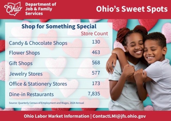 COLUMBUS, Oh. – Ohioans looking for the perfect Valentine’s Day surprise won’t have to look far. New labor market data from Ohio Job and Family Services shows the state is packed with options for sweethearts of all kinds. Ohio boasts 130 candy and chocolate shops, 463 florists, 568 gift shops, and 577 jewelry stores—offering everything from handmade treats to sparkling gems.